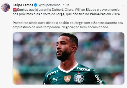 Porém, a diretoria santista não estaria contente apenas com Willian Bigode e quer contratar um outro jogador que foi campeão da Libertadores pelo Palmeiras em 2021. Trata-se do lateral-esquerdo Jorge, que inclusive já jogou no Alvinegro Praiano.