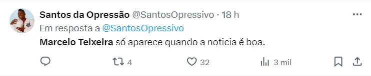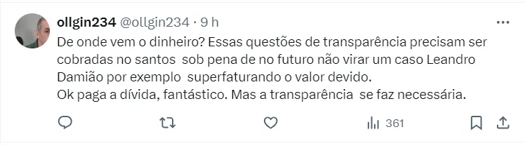 “A direção do Santos demorou esse tempo todo para pagar porque estava tentando um acordo para financiar essa dívida, mas esse acordo infelizmente não aconteceu. O presidente Marcelo Teixeira decidiu pagar à vista para solucionar de vez o problema”, revelou.