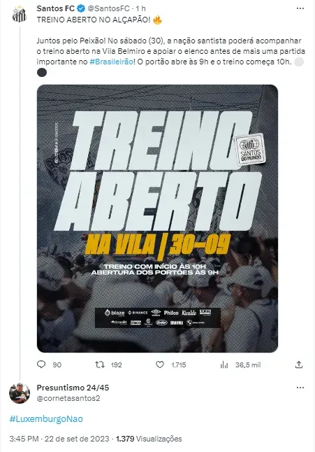 Mais cedo, as redes sociais do Santos anunciaram que o time terá um treino aberto para os adeptos assistirem na Vila Belmiro no dia 30 de setembro, no sábado da outra semana. Entretanto, os aficionados pelo Peixe reclamaram muito pela possível chegada de Luxemburgo. Com o risco de cair, boa parte da torcida esperava que Marcelo Fernandes continuasse a frente do grupo, gerando uma grande movimentação na web.