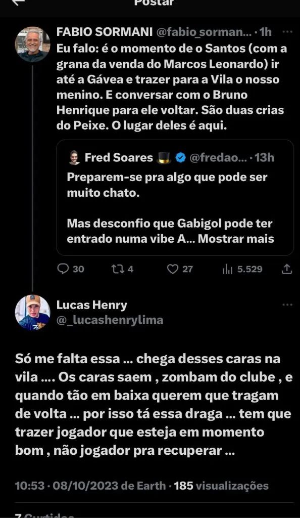 Diante disso, o jornalista Fábio Sormani afirmou que é a hora do Peixe se aproveitar da situação e tentar o retorno de ambos os atletas, pensando em uma possível venda de Marcos Leonardo: (SIC) “Eu falo: é o momento de o Santos (com a grana da venda do Marcos Leonardo) ir até a Gávea e trazer para a Vila o nosso menino. E conversar com o Bruno Henrique para ele voltar. São duas crias do Peixe. O lugar deles é aqui”, disse em seu Twitter. Isso foi noticiado neste sábado (7), pelo Bolavip, mas o jornalista voltou a dizer novamente neste domingo (8), com isso, os santistas deram sua sincera opinião.