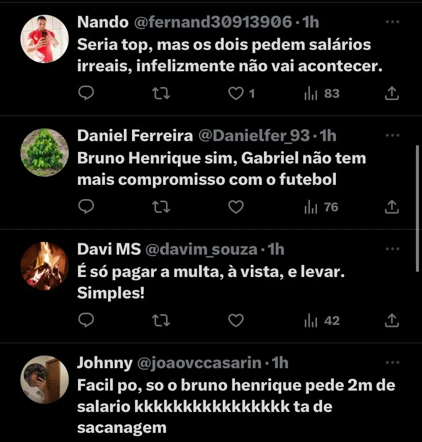 Diante da situação, a torcida do Santos reagiu ao post do comunicador: (SIC) “Seria TOP, mas os dois pedem salários irreais. Infelizmente não vai acontecer”; “Bruno Henrique sim, Gabriel não tem mais compromisso com o futebol”; “Só me falta essa. Chegam esses caras na Vila, eles saem, zombam do Clube e quando estão em baixa querem de volta, por isso está essa draga. Tem que trazer jogador que está em um momento bom”, foram os comentários da torcida santista.