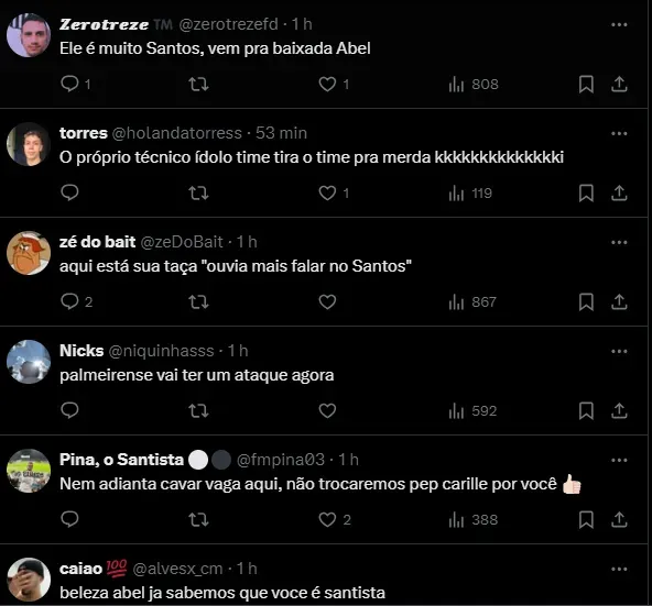 Nas redes sociais, os torcedores do Alvinegro gostaram da fala de Abel Ferreira e fizeram brincadeiras, principalmente comparando a história do Peixe com o Palmeiras.