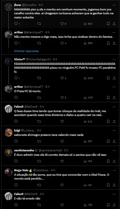 Para se ter ideia, esse mau momento do Alvinegro Praiano fez até com que pessoas fora do Clube se preocupassem e alertassem com o Peixão. Abel Ferreira, técnico do Palmeiras, comentou a má fase do rival em coletiva ao vivo na última segunda-feira (17).