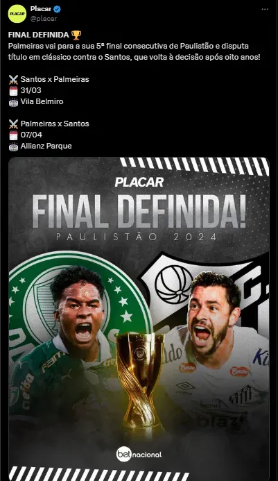 O Peixe já sabe que o primeiro jogo será com seu mando de campo e a segunda partida terá o Palmeiras como mandante. Isso porque a equipe de Abel Ferreira tem a melhor campanha geral da competição. Tanto que já foi definido que o Peixe vai jogar na Vila Belmiro. A ideia inicial era jogar na capital.