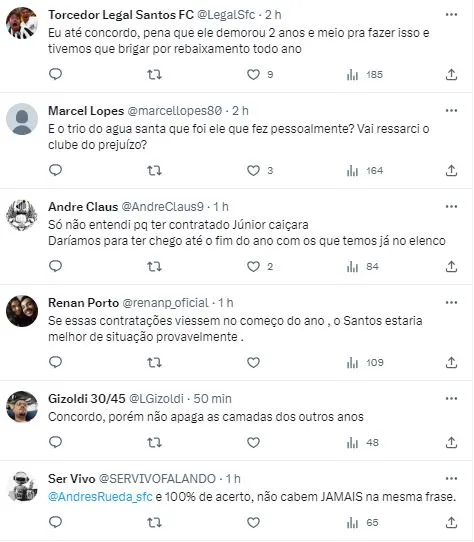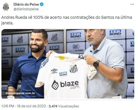 Contudo, Rueda fez questão de abrir o jogo sobre as contratações que foram feitas antes da última janela de transferência e revelou que os erros aconteceram por conta do que o Peixe poderia investir no momento: “Muitas dessas contratações vieram numa situação financeira favorável. A gente trouxe muitas apostas porque era o que cabia no bolso. Não tinha como. Quando faz assim, tem alguns acertos e alguns erros e o resultado final não estava no agrado, não estava mudando o perfil do time”, finalizou. A entrevista também reverberou no portal Diário do Peixe.