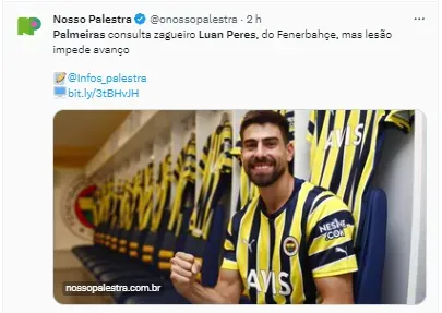 Ainda conforme as informações do portal Nosso Palestra, Luan Peres, de 29 anos, que está no Fenerbahçe, da Turquia, chegou a ter seu nome na pauta do Verdão e os turcos chegaram a receber um contato da diretoria do Palmeiras, mas o fato dele ter sofrido uma cirurgia acabou melando um avanço nas conversas. A tendência é que ele só retorne aos gramados em abril da próxima temporada.