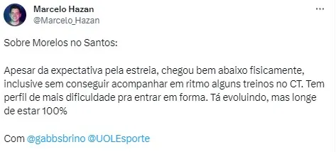 “Sobre Morelos no Santos: Apesar da expectativa pela estreia, chegou bem abaixo fisicamente, inclusive sem conseguir acompanhar em ritmo alguns treinos no CT. Tem perfil de mais dificuldade pra entrar em forma. Tá evoluindo, mas longe de estar 100%”, publicou Hazan em suas redes sociais.