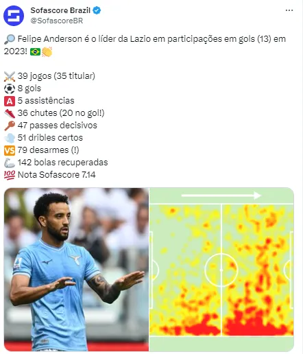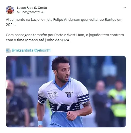 “Atualmente na Lazio, o meia Felipe Anderson quer voltar ao Santos em 2024. Com passagens também por Porto e West Ham, o jogador tem contrato com o time romano até junho de 2024”, publicou o jornalista Lucas Costa em suas redes sociais, seguindo as informações dos comunicadores Jaelson Henrique, do portal Esporte por Esporte, e Marcelo Queirós, do portal Geral Santista.