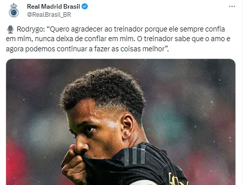 No final, Rodrygo ainda tratou de colocar um ponto final na treta que existia entre ele e Carlo Ancelotti. Ao menos foi dessa forma que a imprensa internacional tratou o caso em que o atleta estaria reclamando de jogar como centroavante. Em forma de apoio ao treinador, o atacante disse o seguinte: “Quero agradecer ao treinador porque ele sempre confia em mim, nunca deixa de confiar em mim. O treinador sabe que o amo e agora podemos continuar a fazer as coisas melhor”.