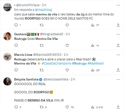 A torcida do Santos acompanha o crescimento meteórico do atacante mesmo de longe, a cada conquista em Madrid. Em 2022, por exemplo, quando Rodrygo virou o confronto diante do Manchester City e colocou o Real na decisão da Champions League, os alvinegros da Baixada esperavam ver a cria da base do Peixe defende os espanhóis na final. A frustração veio quando eles se depararam com o Rayo no banco, o que ficou para trás com a 14ª taça europeia. Agora, a campanha de 2023 é construída pelos pés dos brasileiros novamente.