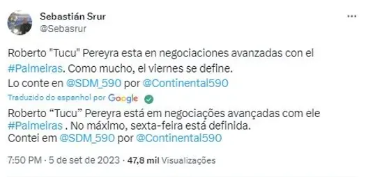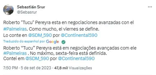 Contudo, nesta terça-feira, uma informação pegou todo mundo de surpresa na Vila Belmiro. Isso porque, segundo o jornalista Sebastián Srur, da ‘Rádio Continental’, da argentina, Roberto Pereyra está em negociações avançadas com o Palmeiras. De acordo com Srur, o acerto deve ser cravado no máximo até a próxima sexta-feira (9).