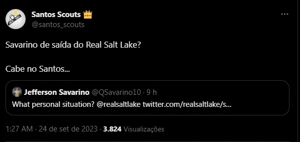 Aproveitando esse gancho de falar do mercado, o torcedor do Peixe está de olho na situação de um possível reforço para 2024. Trata-se do atacante Jefferson Savarino, do Real Salt Lake (EUA). O jogador, que passou pelo Atlético-MG entre 2020 e 2022, “aprontou” na noite de ontem (23) e seu nome repercutiu entre várias torcidas do Brasil, inclusive a do Santos.