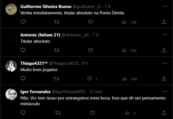 Para contextualizar, o venezuelano fez uma postagem polêmica retrucando o perfil oficial de seu atual clube. Com isso, o assunto rapidamente chegou ao Brasil e parte da torcida do Santos “aprovou” o nome para 2024. O jogador foi campeão pelo Galo em 2021 e deixou o Clube no meio do ano passado. Confira alguns comentários de santistas sobre a possibilidade de contratá-lo: