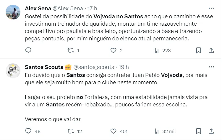 O nome de Juan Pablo Vojvoda é visto como o favorito para assumir a posição. Entretanto, na Sul-Americana com o Fortaleza, o planejamento deve ser muito bem estruturado para convencer o comandante. Vagner ainda destacou que a multa do técnico é de R$ 7 milhões, o que dificultaria a negociação.