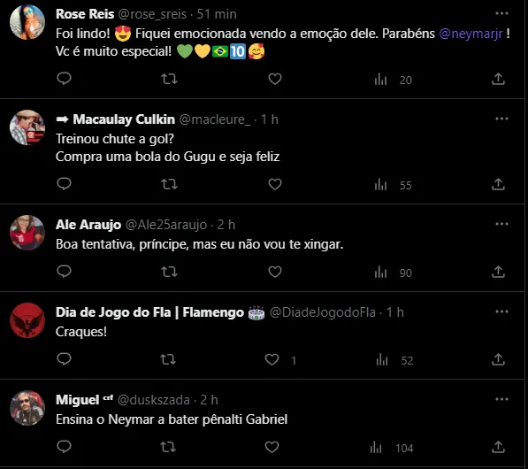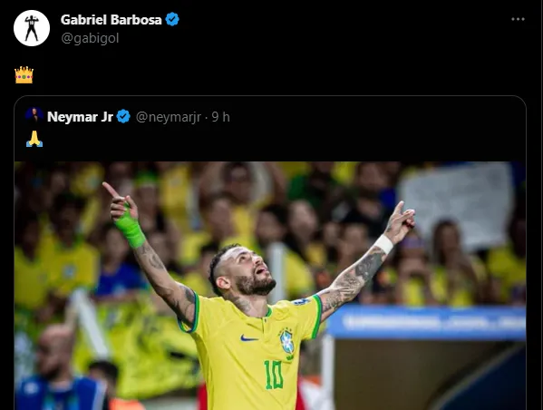 Em suas contas no Twitter e no Instagram, o atual camisa 10 do Flamengo tratou de parabenizar Neymar com uma postagem de uma coroa logo cedo. O jogador publicou a mensagem ainda antes das 7h, ainda no amanhecer. Assim, o assunto repercutiu entre torcedores do Santos e do Flamengo. Confira alguns comentários nas redes: