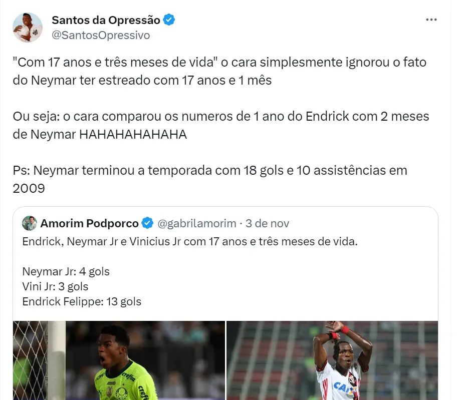 Nesse sentido, o jornalista Gabriel Amorim, do PodPorco, comparou Endrick com Neymar e Vinícius Júnior aos 17 anos e três meses de vida. Nesse período, o atacante palmeirense marcou mais gols.