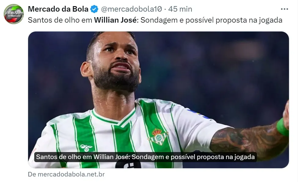 Já Willian José, que está há bastante tempo na Europa, foi oferecido por intermediários. O centroavante de 32 anos recebeu uma sondagem do rival Palmeiras recentemente, porém nenhuma oferta foi enviada.