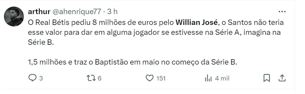 Na última quinta-feira (22), o setorista Filipe Dias informou que o Santos estava analisando as contratações dos atacantes Geuvânio, revelado no CT Rei Pelé e hoje no Juventude, e Willian José, do Real Bétis.