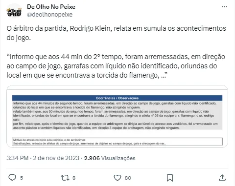 Até então, revoltada com o cartão vermelho dado a Gerson, a torcida do Flamengo arremessou vários objetos em direção ao árbitro Rafael Rodrigo Klein, que chegaram o atingir e o ato foi relatado na súmula. Exposto nas redes, o documento virou meme.