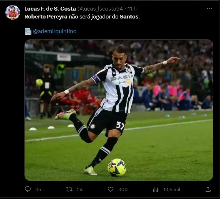 Com isso, alguns nomes começaram a ser ventilados nos bastidores da equipe paulista. O do argentino Roberto Pereyra ganhou força desde a abertura da janela de transferência, mesmo com o jogador externando o desejo em permanecer na Europa. Entretanto, a gestão buscava um acerto e, inclusive, chegou aos valores pedidos pelo representante do jogador. Diante da falta de proposta e com o mercado se afunilando, o Santos se mantinha confiante com um acerto.