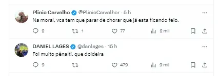 A reclamação seria de que o pênalti não teria acontecido, mas ele foi assinalado com o auxílio do VAR. O lance deu muito o que falar nas redes sociais e segue repercutindo entre torcedores dos dois times.