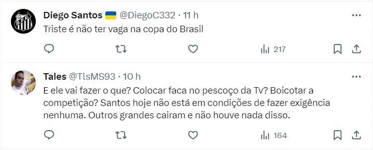 Isso porque, o Santos será o único time ‘grande’ da competição, levando assim, maior visibilidade ao campeonato. Por conta disso, o presidente não acha justo receber os mesmos valores que outras equipes.