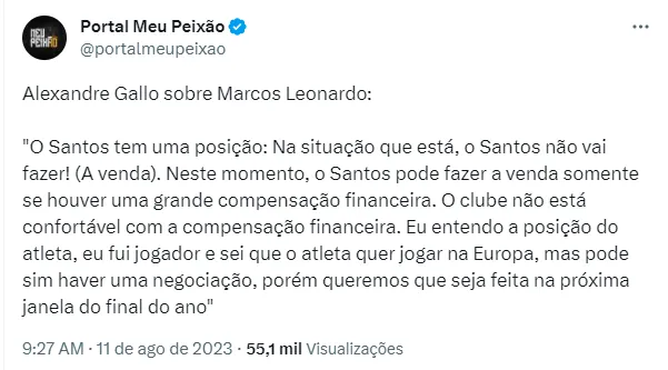 O dirigente, em papo com a Gazeta Esportiva acabou, inclusive, também falando sobre a situação de um jogador do atual elenco que por muito pouco não deixou a Vila Belmiro. Trata-se de Marcos Leonardo, que recebeu proposta da Roma, da Itália, e demonstrou interesse em sair. Gallo acabou revelando um acordo com o camisa 9.