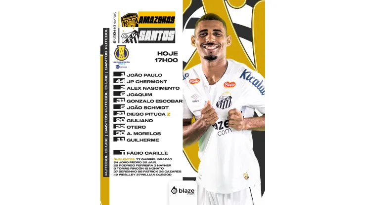 O Peixe vai a campo em Manaus com a seguinte escalação: João Paulo, JP Chermont, Alex Nascimento, Joaquim e Gonzalo Escobar; João Schmidt, Diego Pituca (C) e Giuliano; Otero, Morelos e Guilherme.