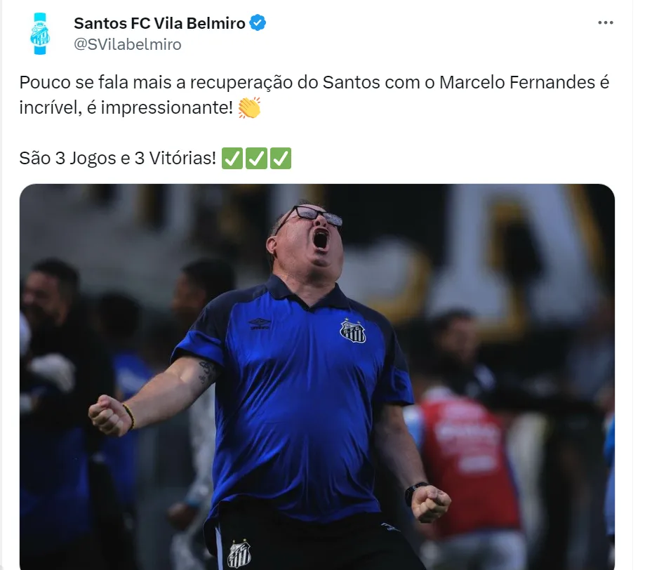 Após perder para o Cruzeiro por 3 a 0, o Santos demitiu Diego Aguirre e o auxiliar Marcelo Fernandes assumiu o comando do time de forma interina. Ele conseguiu três vitórias consecutivas à frente do Peixe e foi efetivado no cargo até o fim da temporada. Com bons resultados, o Alvinegro Praiano não apenas saiu da zona do rebaixamento, como faz um excelente segundo turno no Brasileirão.