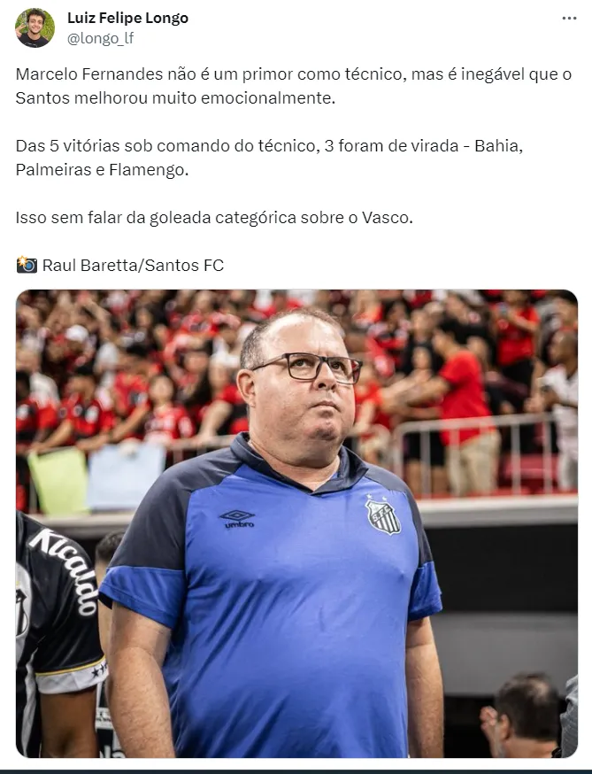 Efetivado como treinador do Santos após mais um período como interino, Marcelo Fernandes mudou o ambiente da equipe, que se tornou mais confiante, melhorando até mesmo a relação com a torcida.