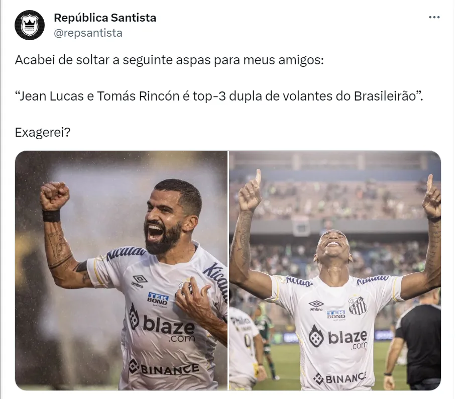 Tomás Rincón é primeiro volante e passou muito tempo na Europa. Com perfil de liderança, em pouco tempo ele virou capitão do Peixe e marcou gols importantes no Brasileirão (contra Vasco e Palmeiras). Já Jean Lucas é um meio-campista moderno, com boa qualidade técnica e vigor físico. Ele deu outra cara para o meio santista. Mérito também para Marcelo Fernandes, que o escalou em sua posição certa: de segundo volante.