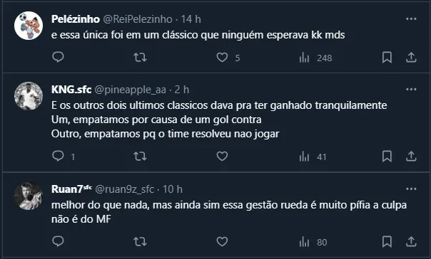 Dito isso, por mais que seja uma dura realidade do torcedor santista ao longo da gestão de Andrés Rueda, o desempenho ficou na média. Nos três anos com o presidente foram 32 clássicos, com sete vitórias, sete empates e 18 derrotas. Isto é, um aproveitamento de 29%.