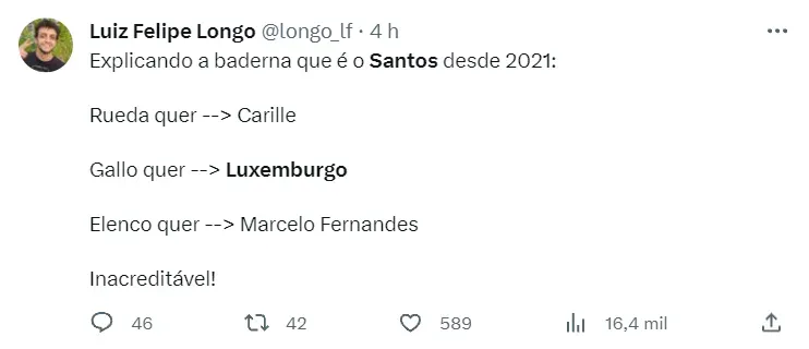 Mas quem não fica triste com isso é a torcida do Alvinegro Praiano. Os adeptos do Santos estão cansados de pedir a permanência de Marcelo Fernandes, que venceu o jogo contra o Bahia e agora pega o Vasco no domingo do dia 1° de outubro. Em disputa direta pela parte de baixo da tabela do Brasileirão, o Peixe receberá o time carioca na Vila Belmiro com a meta de se afastar da degola. O ano vai chegando ao fim e os pedidos de natal só aumentam na Baixada.
