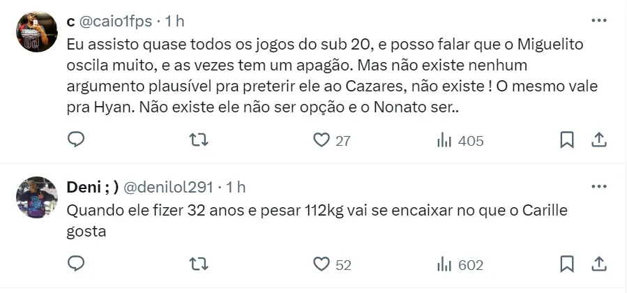 Desta forma, Miguel Terceros ainda não atuou na equipe principal em 2024. O meia tem contrato com o Clube da Vila Belmiro até abril de 2027 e, nas redes sociais, muitos torcedores pedem chance ao jogador no profissional.