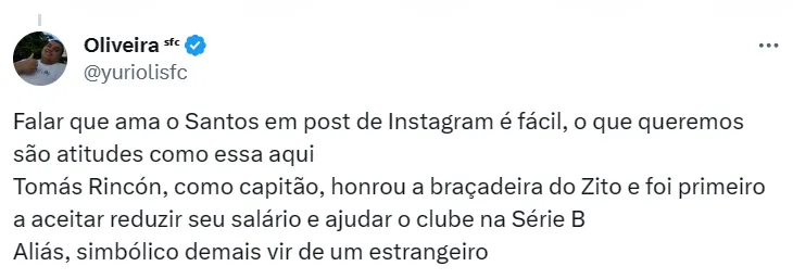 “Dentro da nova política salarial do clube, a nova gestão do Santos FC, que começará oficialmente no dia 2 de janeiro, garantiu neste sábado (16) a permanência do volante venezuelano Tomás Rincón para a próxima temporada, que começará com a disputa do Campeonato Paulista de 2024”, dizia parte do anúncio.