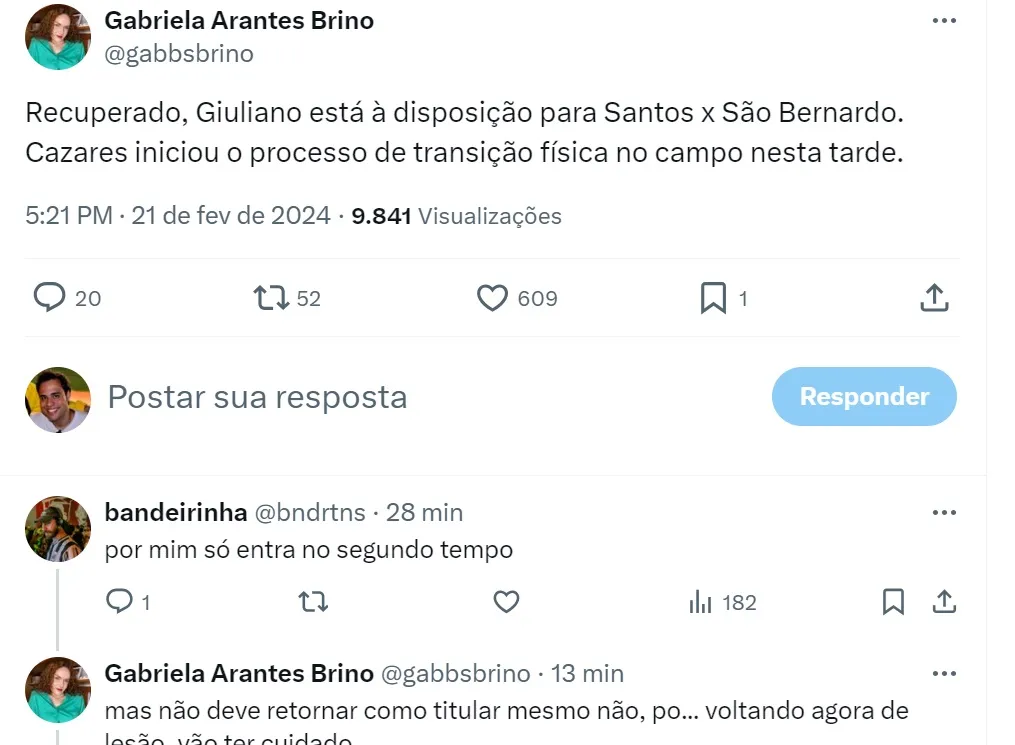 Nesta quarta, o elenco alvinegro voltou de folga e Carille teve boas notícias no CT Rei Pelé. Assim como a setorista Gabriela Brino apurou, o meia Giuliano está recuperado de edema na panturrilha e vai a campo contra o São Bernardo.