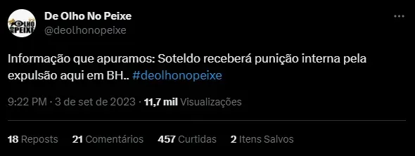 Resta saber se as falas do venezuelano poderão ser usadas pelo tribunal para uma possível punição mais pesada ao jogador, que já é ‘recorrente’ no assunto de reclamações com a arbitragem. Neste mesmo Brasileirão, Soteldo foi expulso contra o Grêmio e ‘soltou o verbo’ contra o árbitro Wilton Pereira Sampaio.