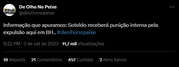 “Expulsão com cartão vermelho direto por após receber um cartão amarelo proferir as seguintes palavras: ”faz tempo que apita só contra nós, caralho, vai se fuder”, escreveu o árbitro no documento, que pode servir como base para um possível julgamento de Soteldo no STJD. De acordo com o ‘De Olho no Peixe’, a diretoria do Santos pode punir Soteldo pelo cartão vermelho.