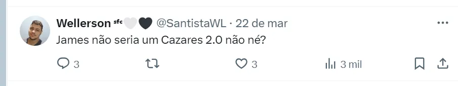 Como informou Vagner Frederico, o Alvinegro Praiano poderia ter James por empréstimo até o fim do ano pagando um salário de R$ 500 mil mensais, mas considerou um valor muito alto para um jogador que soma poucas partidas nesta temporada.
