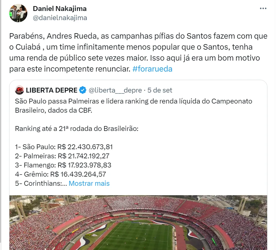 Por falar em Vila Belmiro, o Santos alcançou nesta semana mais uma marca negativa sob a gestão de Rueda. De acordo com levantamento feito por Danilo Lavieri, colunista do UOL Esporte, o Peixe é o time dos considerados grandes do país que menos arrecada em bilheteria. No ranking geral, o Alvinegro é o 16º colocado.