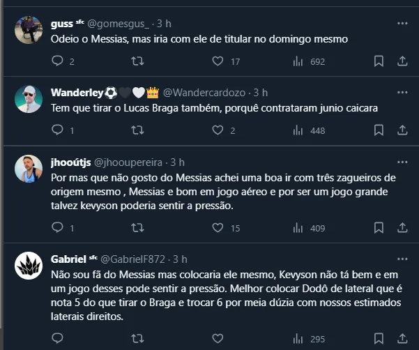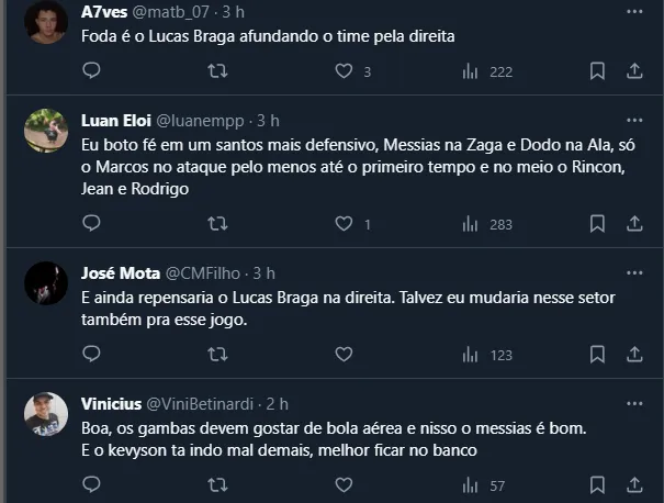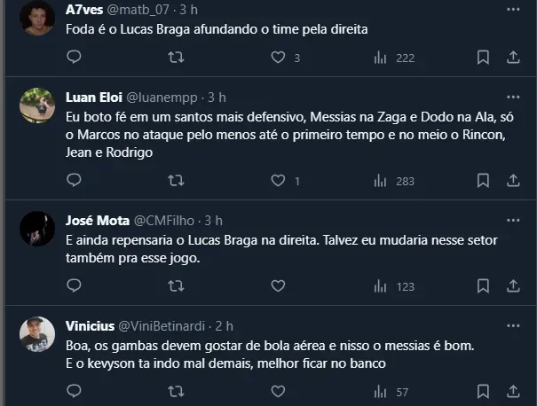 Além disso, além de elogios à entrada de Messias, santistas também foram às redes sociais pedir a saída de outro titular do time diante do Corinthians. Trata-se de Lucas Braga, que também vem realizando partidas ruins defensivamente.