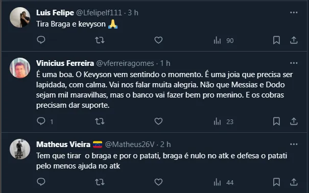 Não à toa, aproveitando a notícia de que Kevyson sairá da equipe, alguns torcedores do Santos aprovaram a entrada de Messias, que já foi muito contestado em partidas recentes e não vive uma grande temporada.
