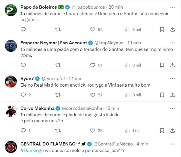 Segundo o portal GOAL, o valor desejado é de 15 milhões de euros (R$ 79 milhões) + bônus. O staff do jogador de 20 anos tem recebido consultas fortes da Europa.