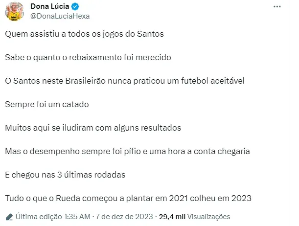 Junto com o Clube Paulista caem Goiás, Coritiba e América-MG. Em contrapartida, Vitória, Juventude, Criciúma e Atlético Goianiense irão disputar a Série A na próxima temporada. Agora resta ao Santos se reestruturar e voltar à primeira divisão em 2025.