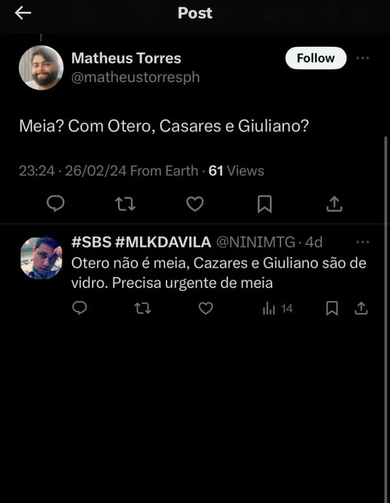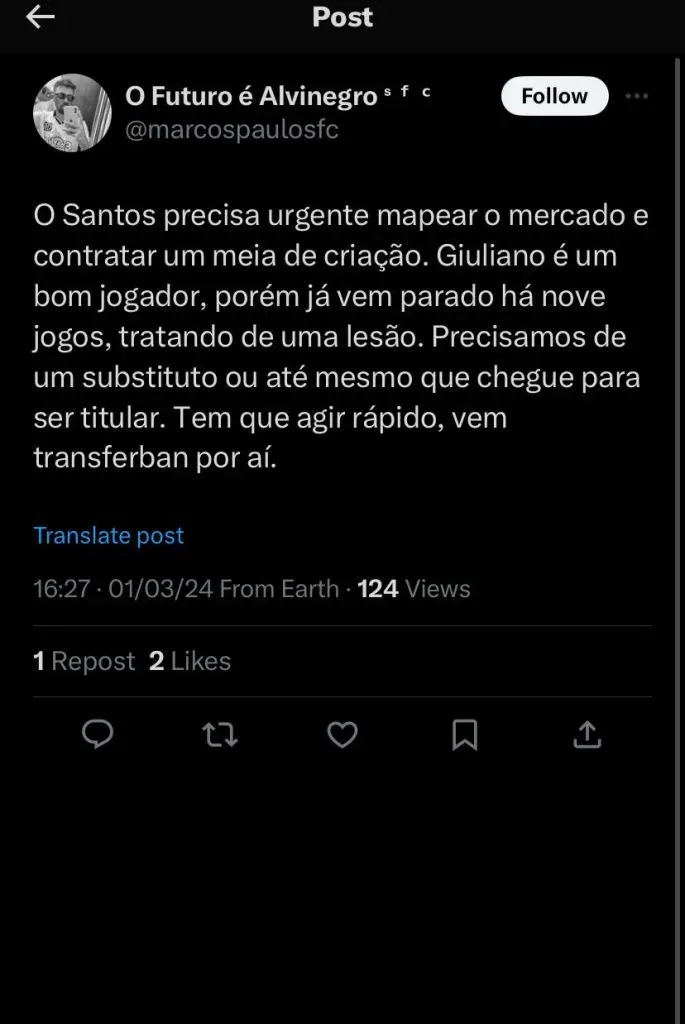 Com isso, nas redes sociais, a torcida pediu a contratação de mais um meia, mas sem dar nomes: (SIC) “O Santos precisa urgente mapear o mercado e contratar um meia de criação. Giuliano é um bom jogador, porém já vem parado há nove jogos, tratando de uma lesão. Precisamos de um substituto ou até mesmo que chegue para ser titular. Tem que agir rápido, vem transfer ban por aí”, disse um torcedor.