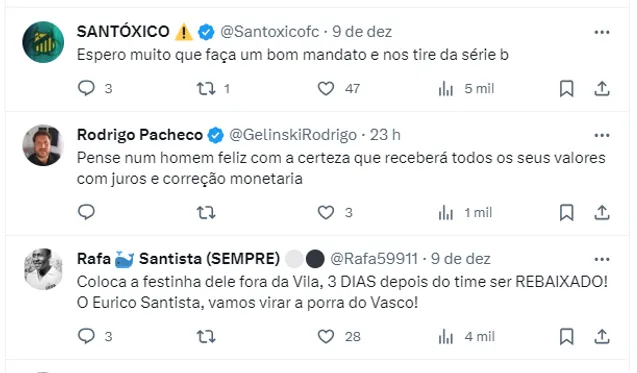 Sobretudo, o Santos segue com cautela, tendo em vista que já conseguiu um grande estrago ao cair pela primeira vez em sua história. Agora, cabe ao novo presidente fazer um melhor trabalho.