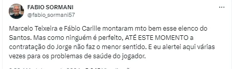 Fábio ainda revelou quais as posições que estão sendo analisadas para reforços chegarem. Foi exposto que os setores do elenco que devem ser reforçados para o Peixe são: um zagueiro, um lateral-esquerdo e um atacante para o lado do campo.