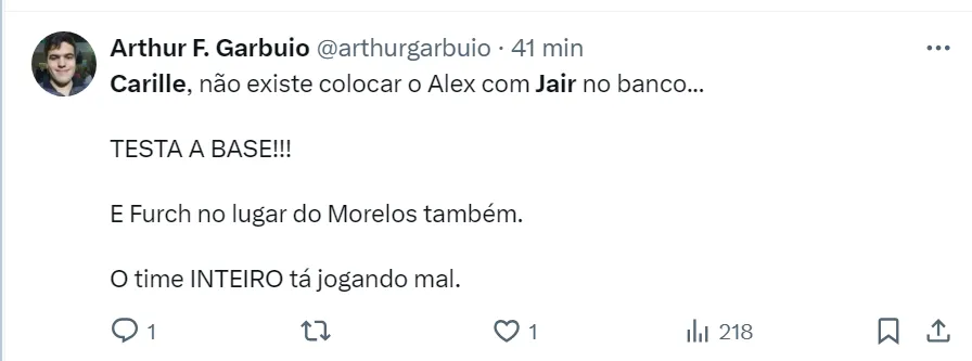 Na partida em Manaus, o treinador Fábio Carille optou por preservar o experiente Gil e Alex foi o substituto. No entanto, o defensor de 25 anos não teve uma boa atuação e torcedores fizeram muitas críticas.