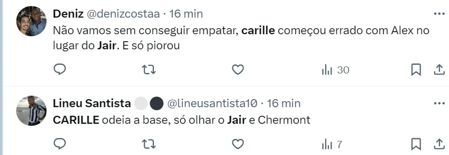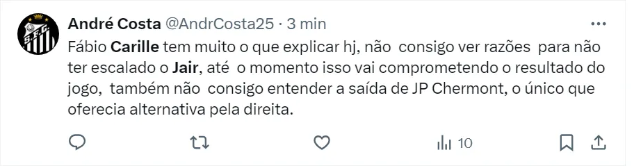 Nas redes sociais, o antigo Twitter, os santistas questionaram o motivo do técnico santista não ter escalado Jair, jovem das categorias de base do clube. O Menino da Vila tem 19 anos e é apontado como um grande joia revelada pelo alvinegro.