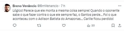 Após a partida, o técnico Fábio Carille abordou a situação do atacante que vinha sendo um dos trunfos do Santástico: “Guilherme faz uma temporada muito boa desde o Campeonato Paulista, jogador importante. Vamos analisar com calma as alternativas. Quem jogar, vamos dar todo o apoio para fazer um bom jogo”.